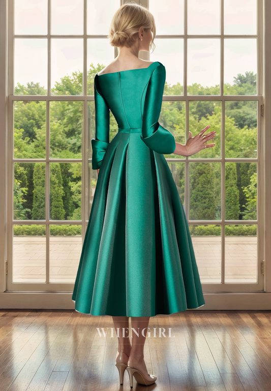 A-Line Off Shoulder 34 Length Sleeves Lace Appliques Pleated Tea Length Mother of Bride Dress