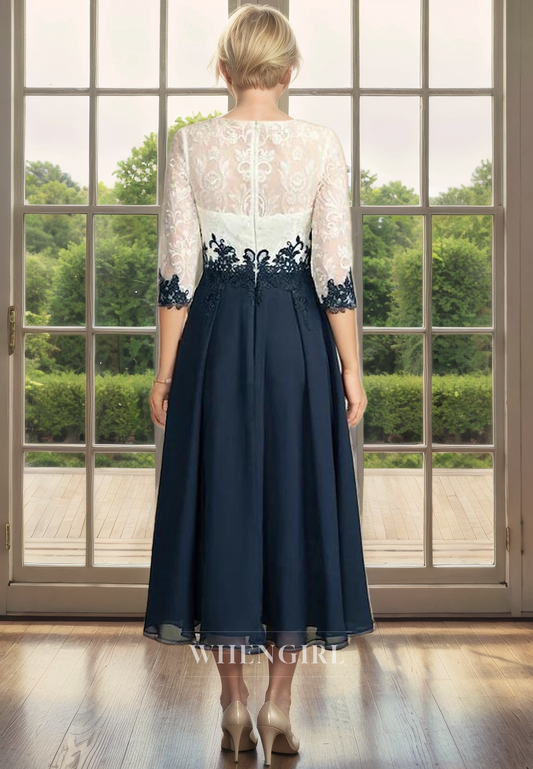 A-Line Scoop Neck 34 Length Sleeves Lace Pleated Chiffon Tea Length Mother of Bride Dress