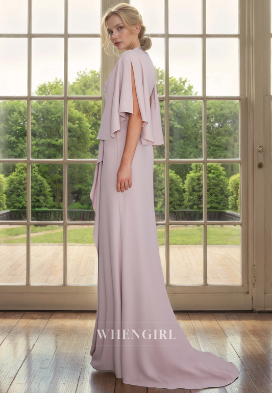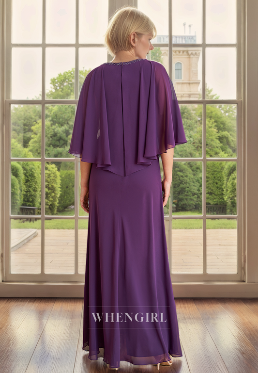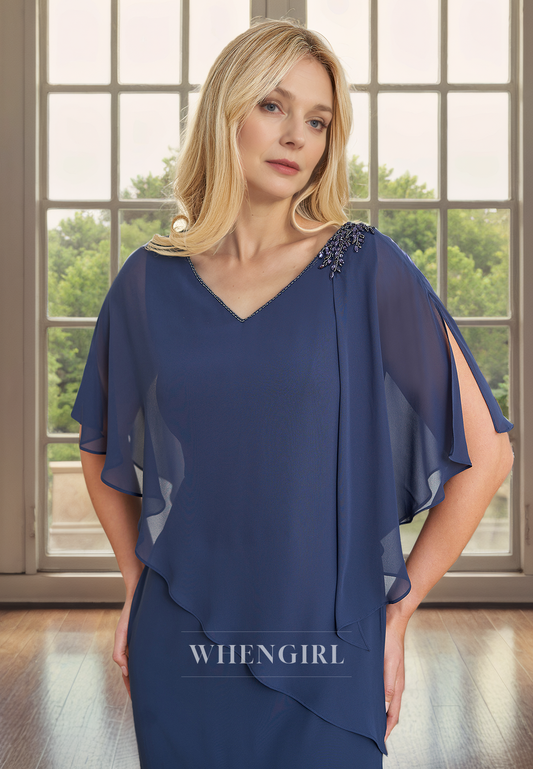 Column V Neck Half Sleeves Ruffles Beaded Back Zipper Chiffon Mother of Bride Dress with Slit