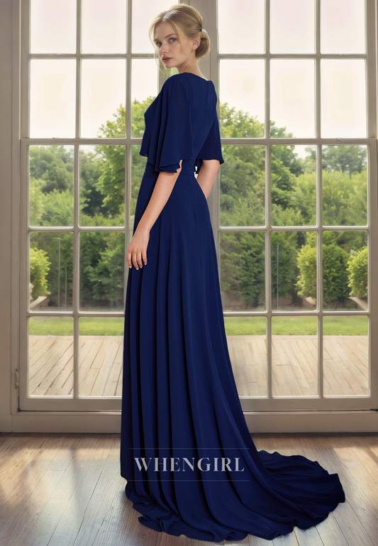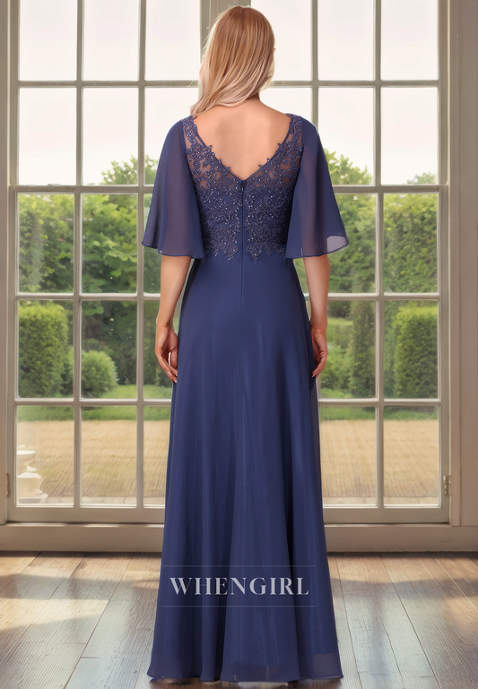 A-Line V Neck Half Sleeves Back Zipper Chiffon Mother of Bride Dress with Slit