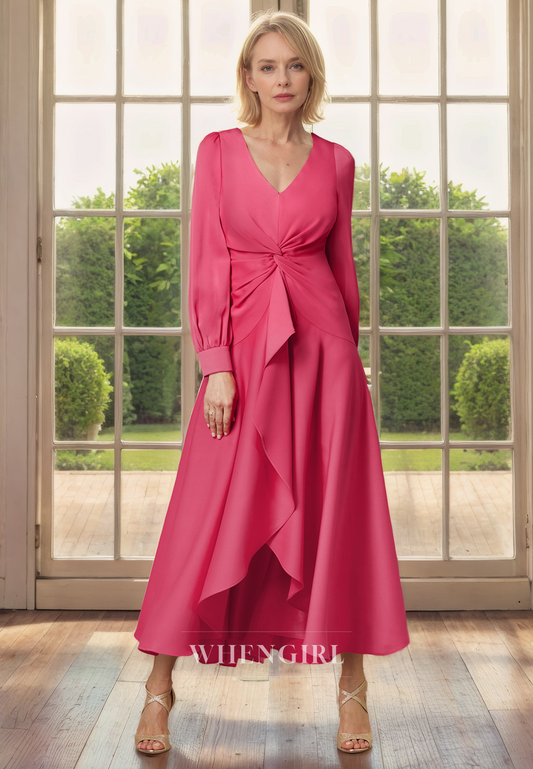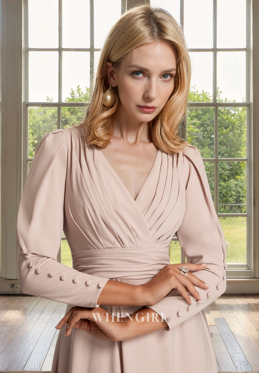 A-Line V Neck Long Sleeves Pleated Tea Length Mother of Bride Dress