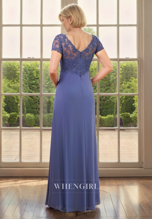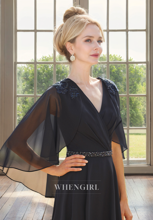 A-Line V Neck Half Sleeves Appliques Beaded Back Zipper Chiffon Mother of Bride Dress