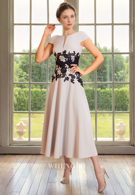 A-Line Scoop Neck Short Sleeves Lace Appliques Tea Length Mother of Bride Dress