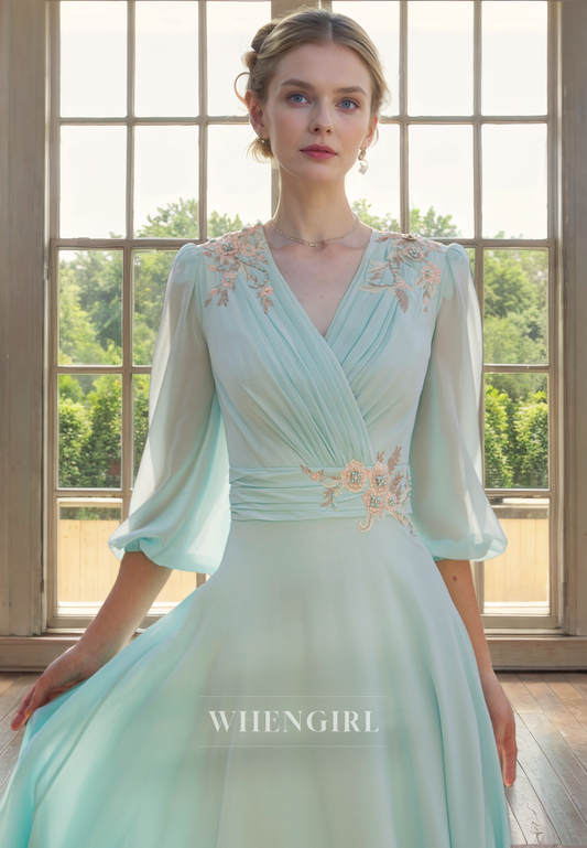 A-Line V Neck 34 Length Sleeves Pleated Appliques Tea Length Chiffon Mother of Bride Dress