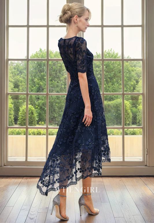 A-Line V Neck Half Sleeves Lace Appliques Tea Length Mother of Bride Dress