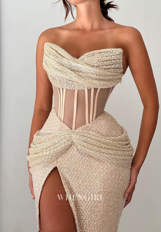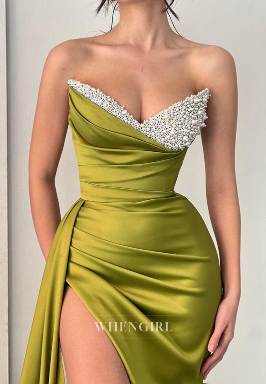 Sheath Full Beaded Strapless Sleeveless Pleated Side Slit Formal Prom Dress
