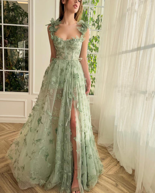 A-Line Square Strapless Sleeveless 3D Butterfly Long Prom Dress with Slit