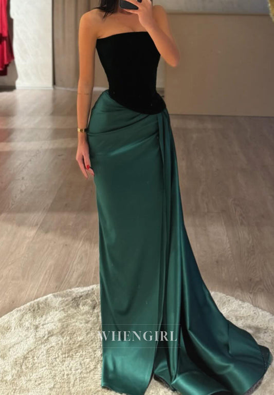 Classic Tube Top Sleeveless Side Slit Fitted Satin Pleats Prom Formal Gowns with Train