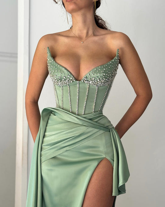 Beaded Sweetheart Sheath Party Dress Side Slit Pleats Satin Long Prom Dress with Train