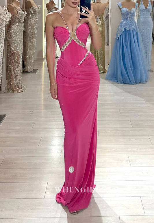 Sheath V Neck Beaded Sleeveless Pleated Side Slit Sweep Train Prom Dress