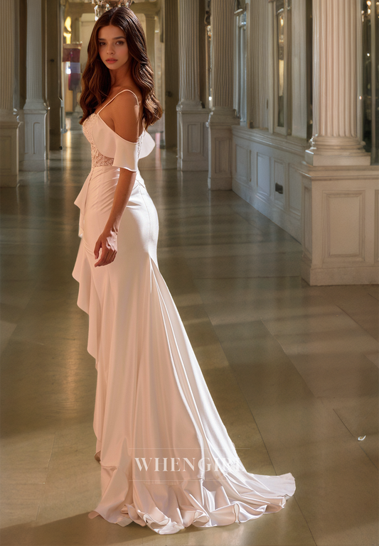 Classic Spaghetti Straps Sheath High Slit Pleats Lace Formal Party Dress with Appliques