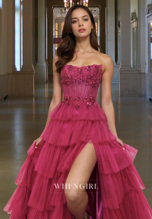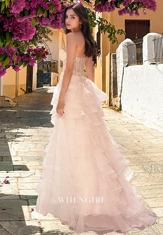 Elegant A-Line Tube Top Sleeveless High Slit Tiered Lace Ball Gown with Applique