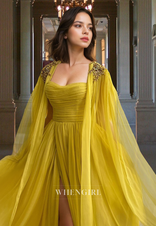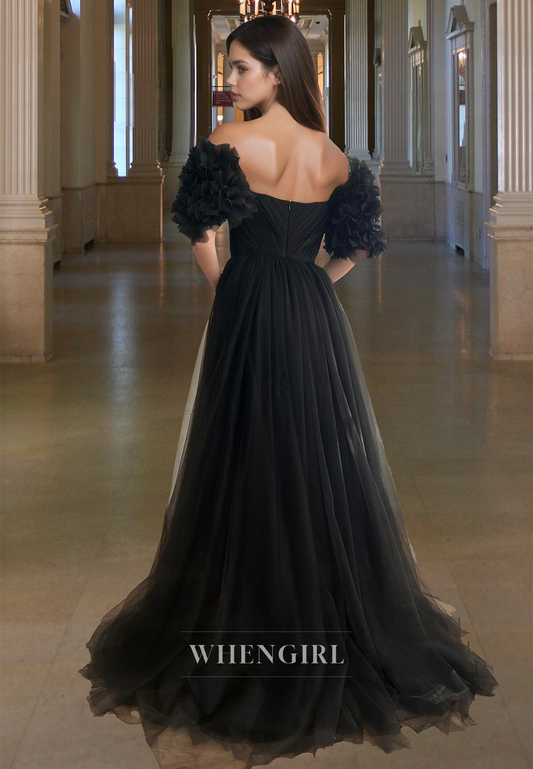 Elegant A-Line Sleeves Sweetheart Long Pleated Lace Formal Prom Dress with Slit