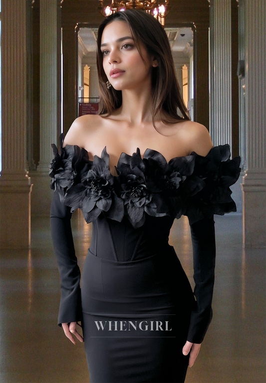 Classic Long Sleeves Strapless Mermaid Floral Satin Formal Gown with Floral Prom Dress