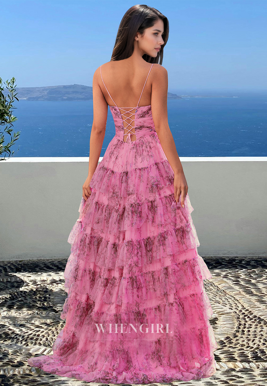 Elegant Spaghetti Straps A-Line Appliques Tiered Lace Evening Party Dress with Beads