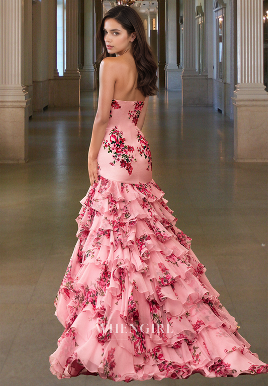 Graceful Tube Top Sleeveless Mermaid Tiered Lace Appliques Formal Prom Dress with Train