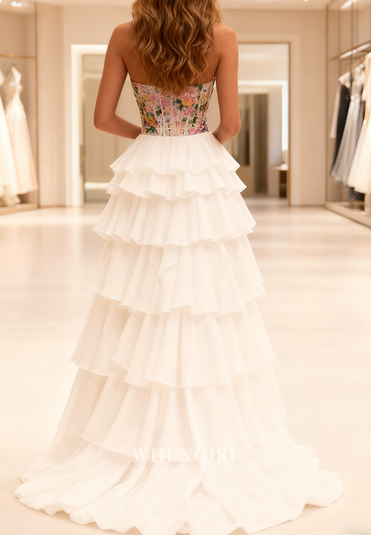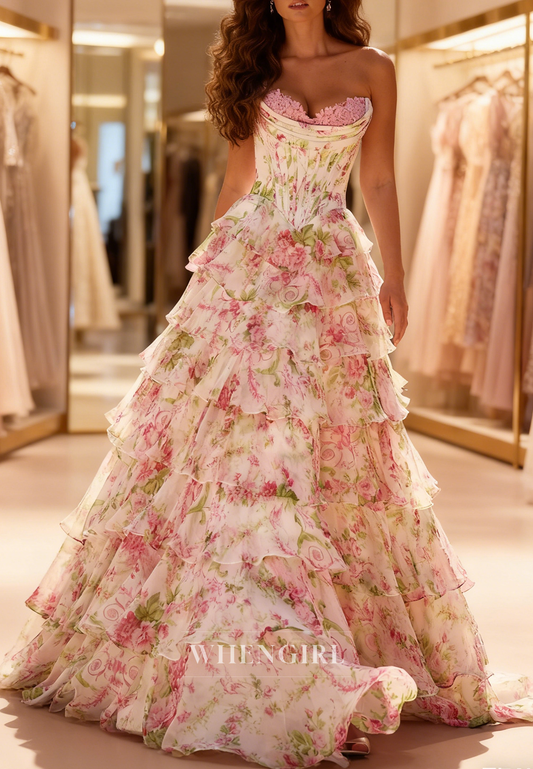 A-Line Floral Sweetheart Sleeveless Multi Tiered Side Slit Floor Length Prom Dress