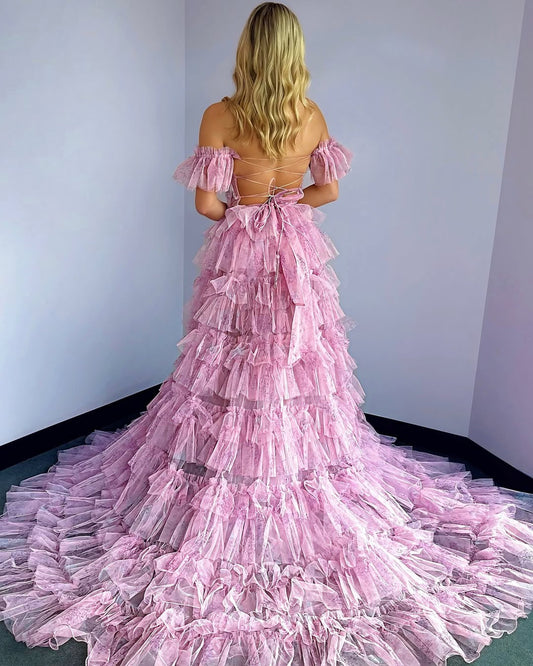 Pink Sweetheart Sleeveless Side Slit Multi Tired Ruffles Lace Up Prom Dress
