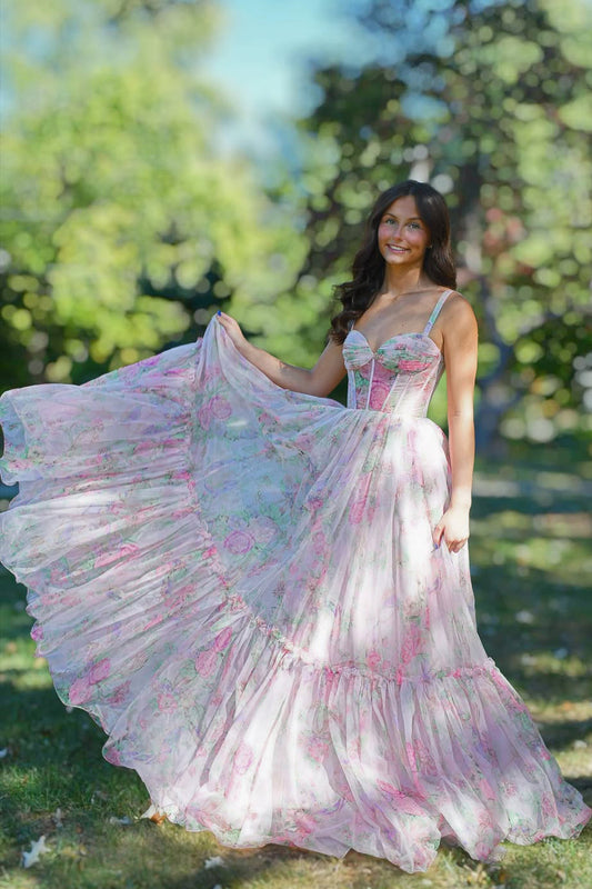 Fairy A Line Pink Chiffon Floral Print Satin Prom Dress with Slit