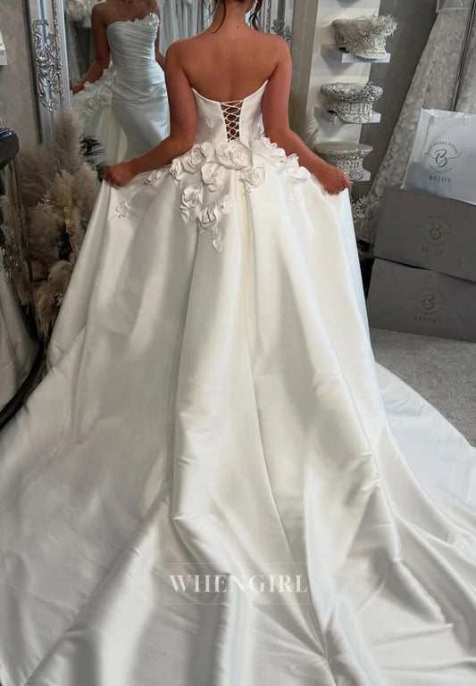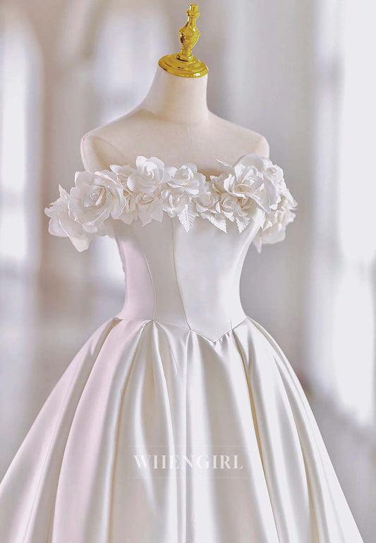 3D Flowers Off Shoulder Sleeveless Lace Up Bowknot A-Line Satin Court Train Wedding Dress