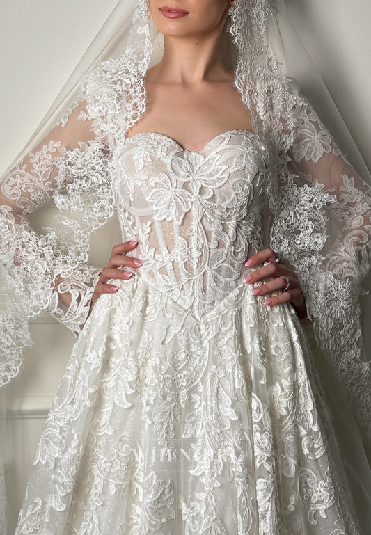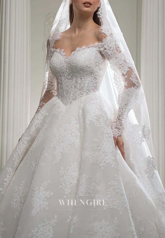 A-Line Sweetheart Long Sleeves Appliqued Lace Court Train Wedding Dress