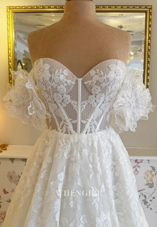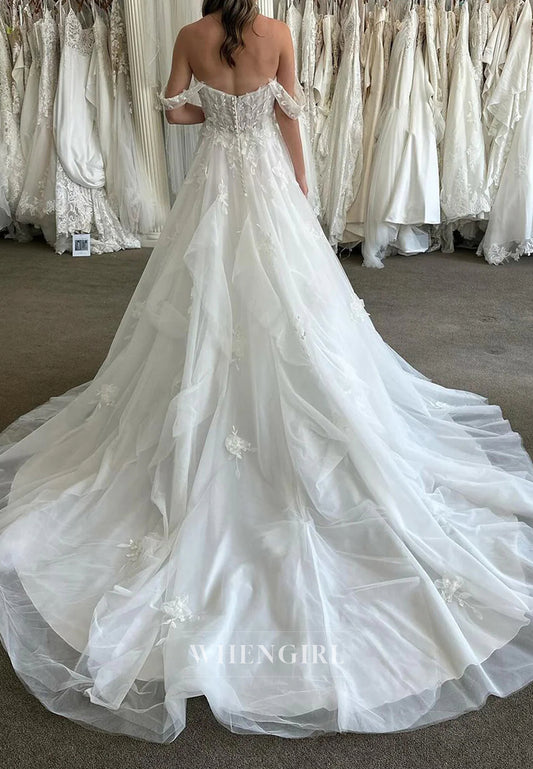 Sweetheart Off Shoulder Appliqued Lace A-Line Sweep Train Wedding Dress