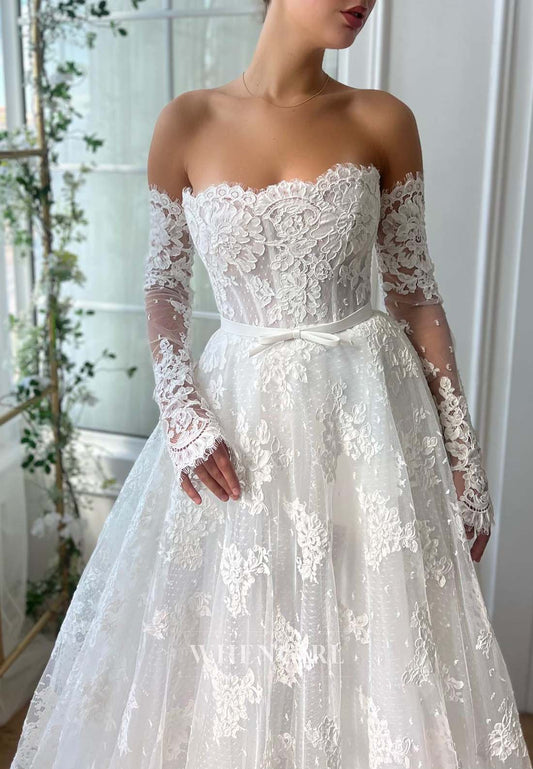 Off Shoulder A-Line Long Sleeves Lace Court Train Wedding Dress