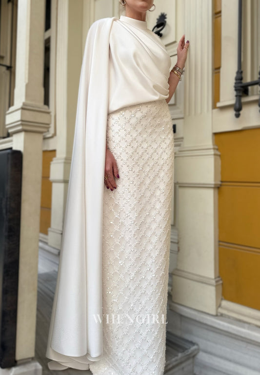 Sheath Satin Floor Length High Neck Beading Elegant Pleating Wedding Dress