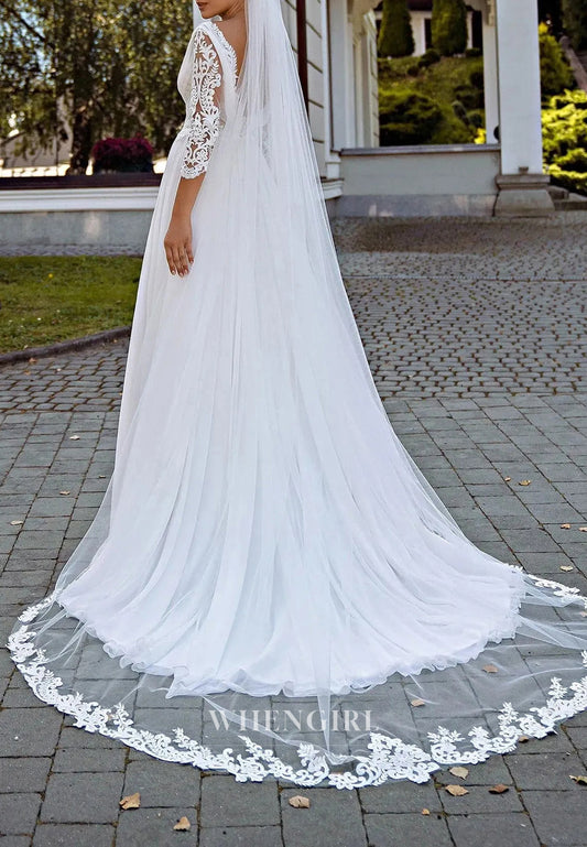 A-Line V Neck Long Sleeves Lace Court Train Lace Wedding Dress