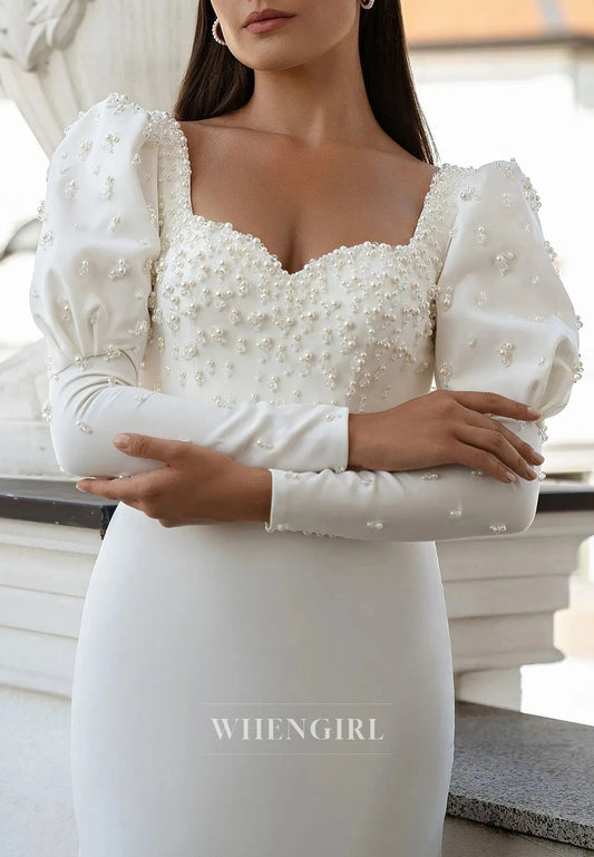 Sheath Sweetheart Satin Long Sleeve Beaded Wedding Dresses with Court Train