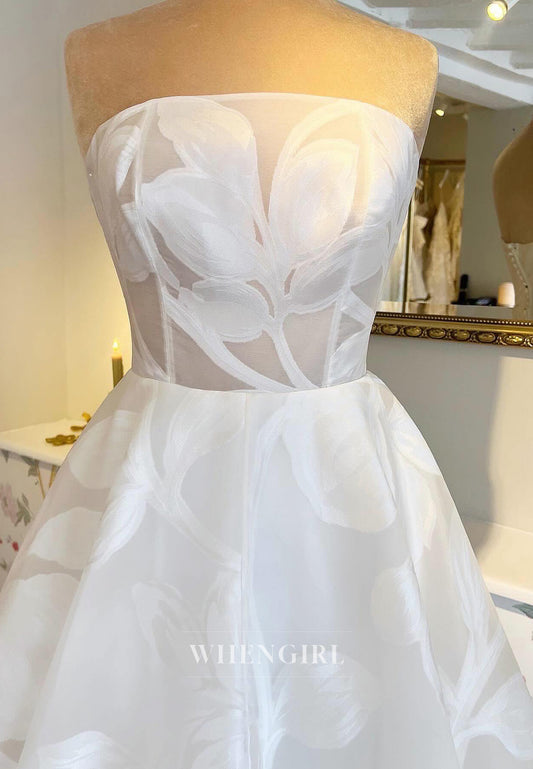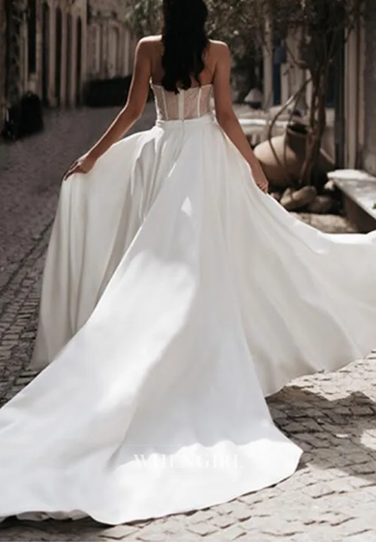 A-Line Strapless Pearls Lace Sleeveless Wedding Dress with Sweeep Train