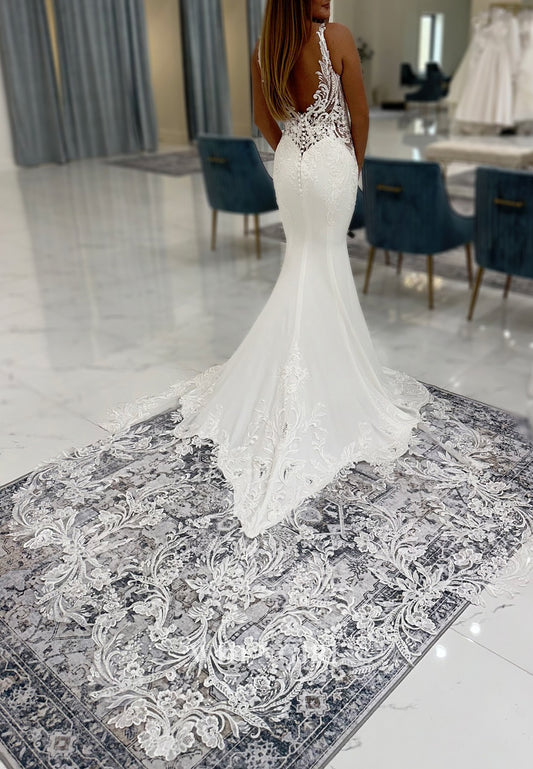 Mermaid V Neck Appliqued Lace Regular Straps Sleeveless Court Train Wedding Dress