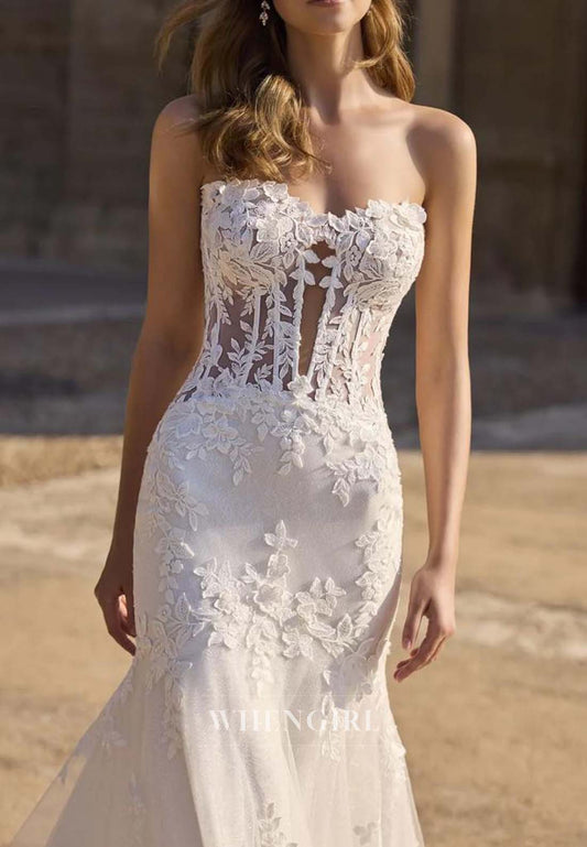 Tube Top Sleeveless Appliqued Lace Cut Out Sweep Train Mermaid Wedding Dress