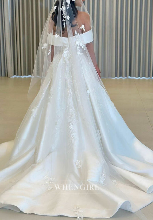 A-Line Off Shoulder Appliqued Court Train Sleeveless Wedding Dress