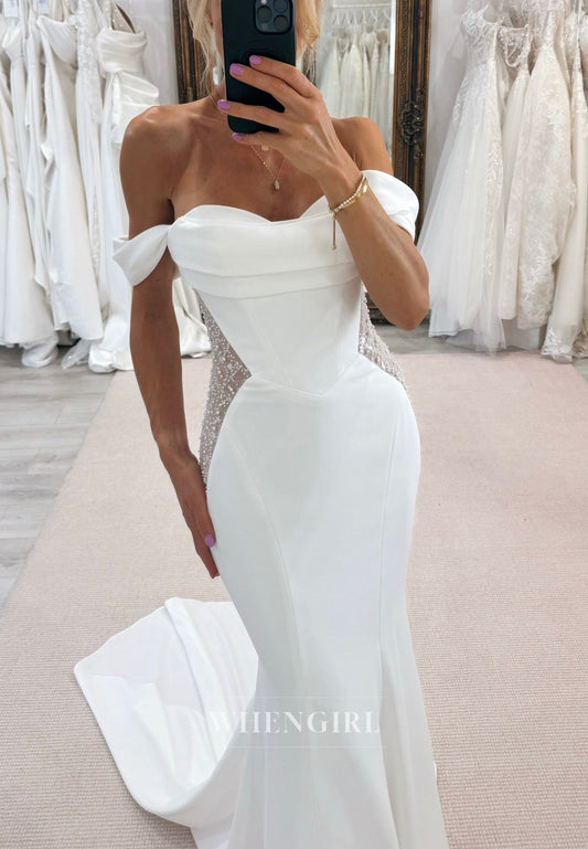 Mermaid Off Shouder Beaded Sleeveless Sweep Train Wedding Dress