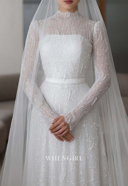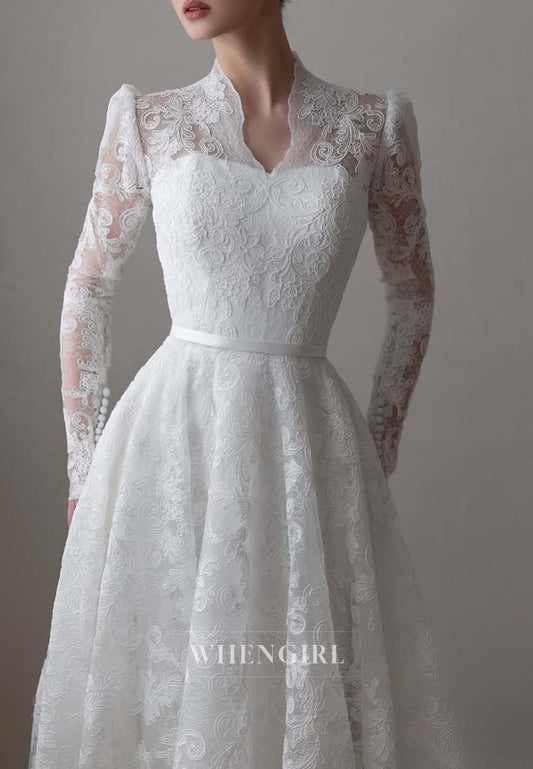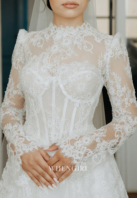 A-Line High Neck Long Sleeves Sweep Train Lace Wedding Dress