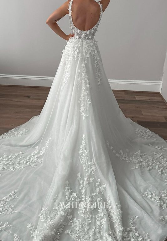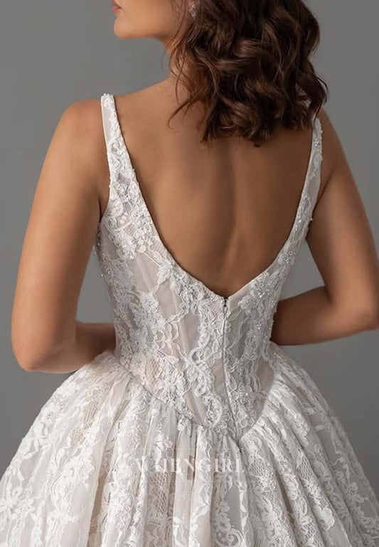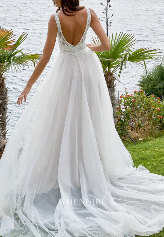 A-Line Appliqued Lace V Neck Sleeveless Tulle Beach Wedding Dress with Sweep Train