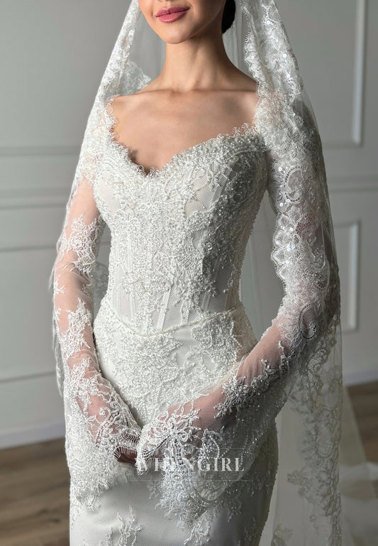 Sheath Sweetheart Long Sleeves Beaded Lace Wedding Dress with Sweep Train