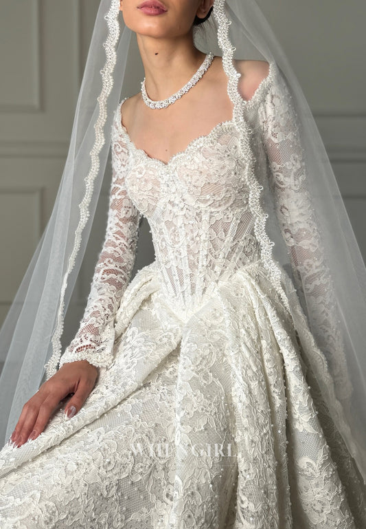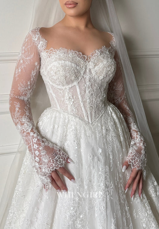 A-Line Sweetheart Long Sleeves Beaded Lace Wedding Dress