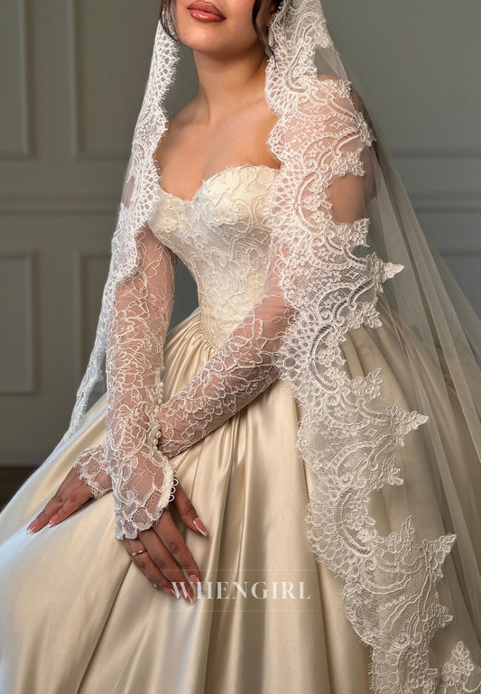 A-Line Sweetheart Long Lace Sleeves Satin Hem Wedding Dress