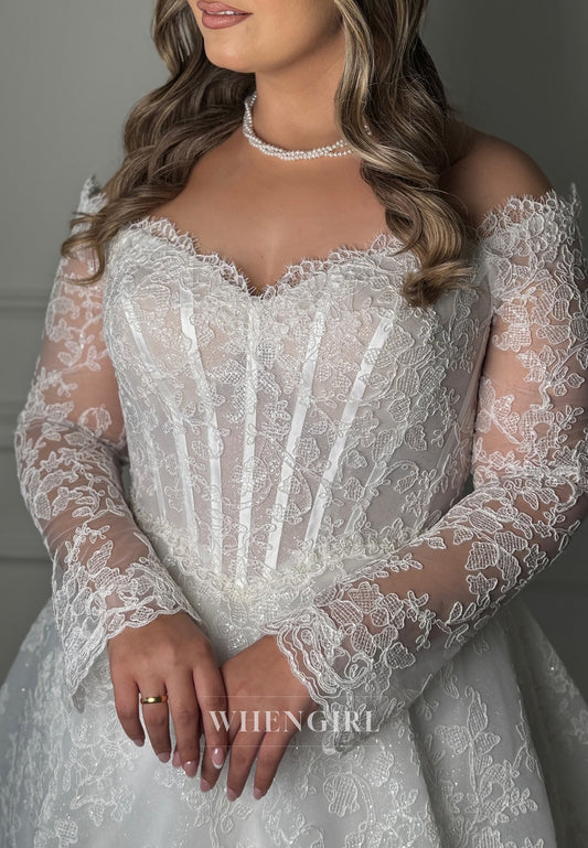Sweetheart Long Sleeves Off Shoulder Appliqued Lace Mermaid Wedding Dress with Sweep Train