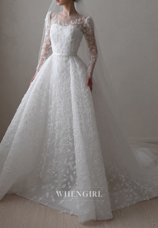 A-Line Illusion Neck Long Sleeves Sequins Beaded Floral Wedding Dress