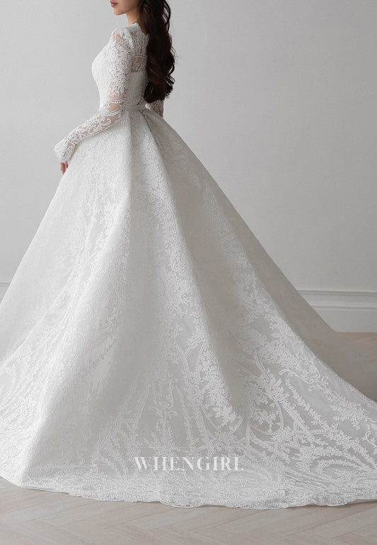 A-Line Appliqued Lace Long Sleeves Illusion Neck Court Train Beaded Wedding Dress