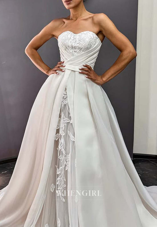 Sweetheart Sleeveless Pleated Appliqued A-Line Wedding Dress with Court Train