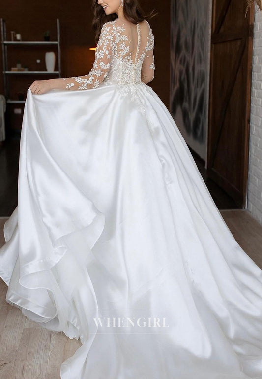 V Neck Long Sleeves Appliqued Lace A-Line Satin Court Train Wedding Dress