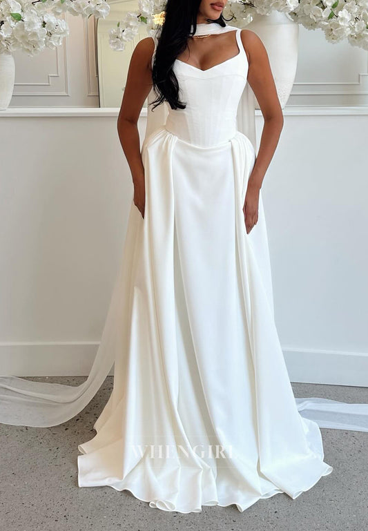 Simple Sheath V Neck Regular Straps Sleeveless Wedding Dress with Scarf