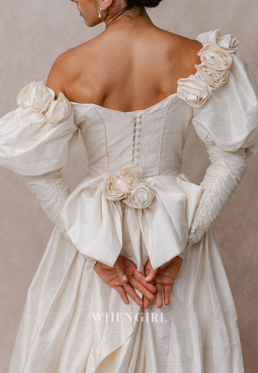 Off Shoulder Long Sleeves A-Line Appliqued Lace Long Wedding Dress