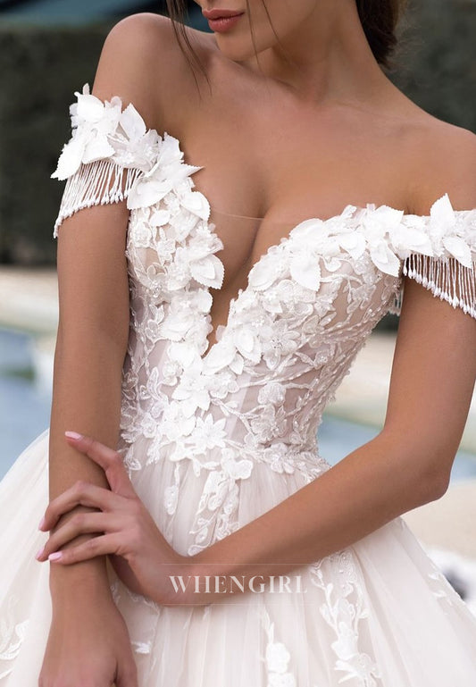 V Neck Tassel Off Shoulder Appliques Tulle A-Line Wedding Dress with Chapel Train