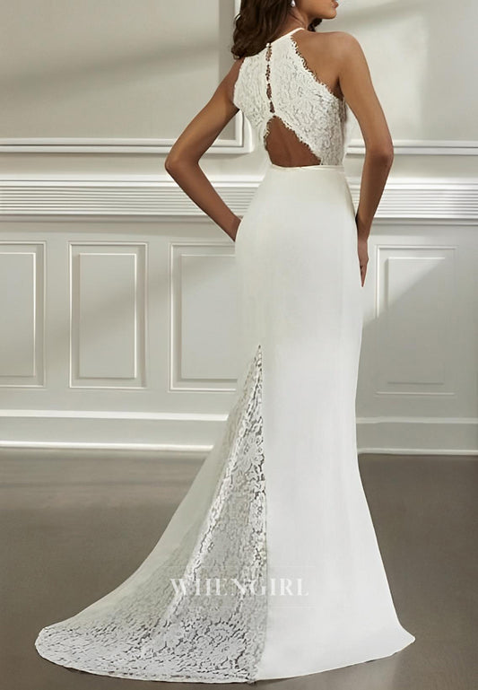 A-Line High Neck Embroidered lace Wedding Dress with Watteau Train