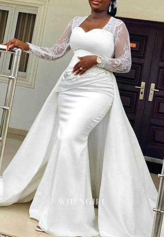 Mermaid Off Shoulder Long Lace Sleeves Satin Wedding Dress